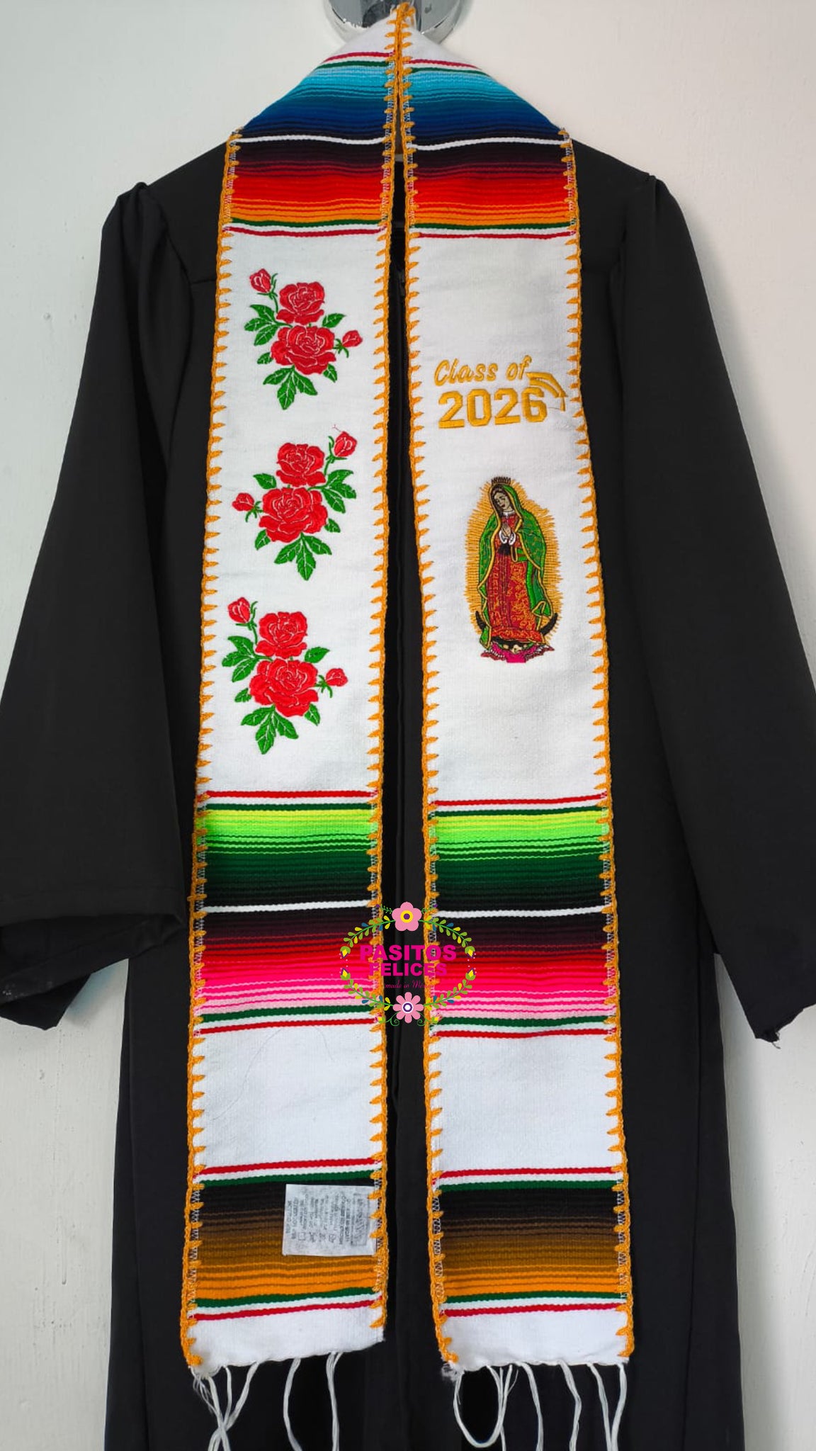 2026 Virgen and Roses w/ gold border -  White Stole Sarape Sash Preorder