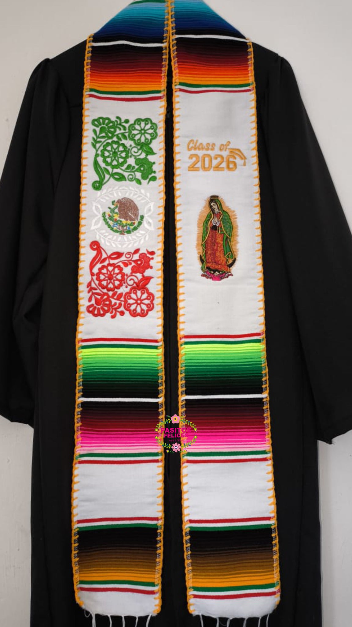 White Mexico Floral w virgen Graduation Stole Sarape Sash IN STOCK